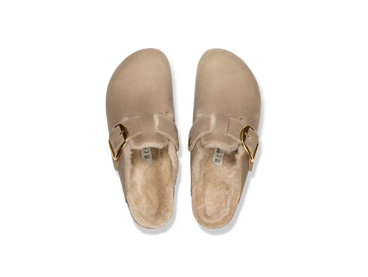 Le modèle Boston, en cuir nubuck huilé naturel, est un incontournable BIRKENSTOCK, à porter toute l'année grâce à son design classique et ajustable. Cette version se distingue par sa semelle de propreté et sa bride doublées de fourrure d'agneau naturelle, qui apportent une chaleur douce et un style authentique. La tige est réalisée en nubuck huilé épais, aux bords bruts non lissés, renforçant le caractère naturel et robuste de la chaussure.