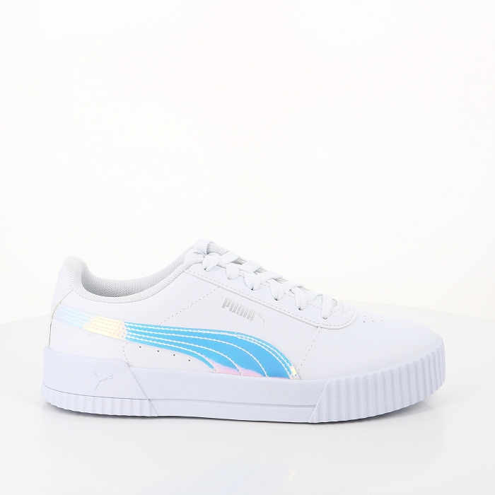 Les baskets Carina ont un style vintage qui est d'actualité. C'est un incontournable de la marque Puma. C'est une sneaker avec la semelle épaisse et une tige en cuir blanc. Ces chaussures iront avec tous les styles et toutes les tenues. Elles ont une tige en cuir blanc, et un empiècement argent brillant sur le côté de la chaussure.