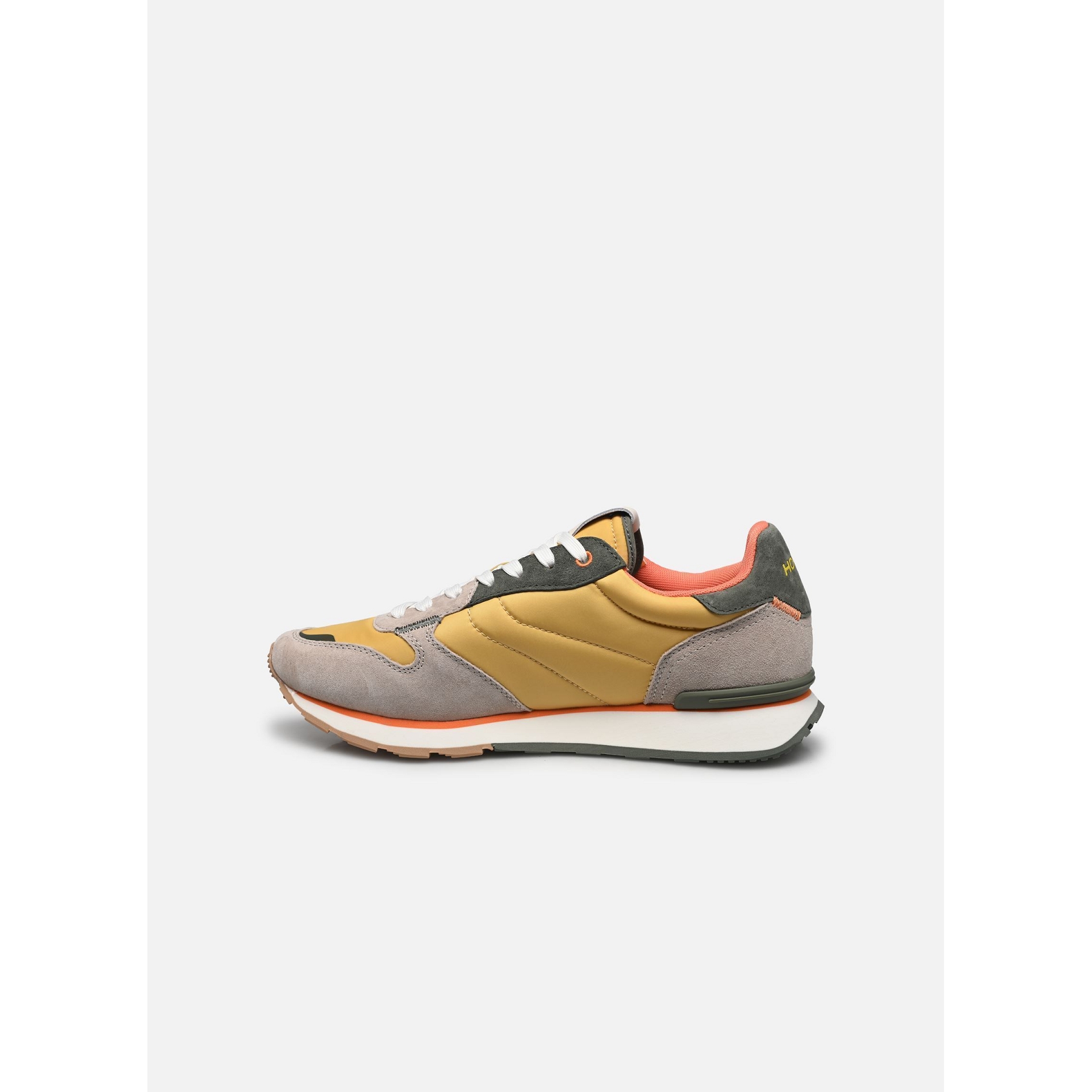 Sneaker style rétro en combinaison de matériaux et de couleurs pour un look unique.